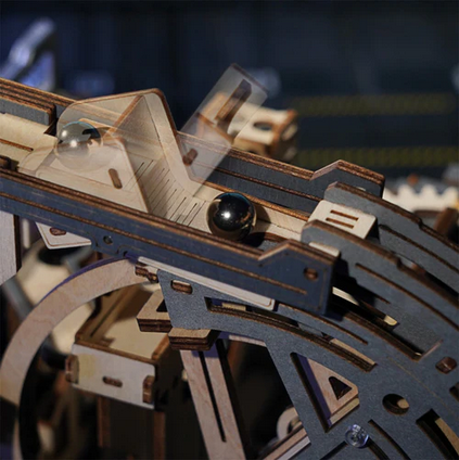 Once assembled, it becomes a mesmerizing kinetic display, where marbles race through loops, spirals, and lifts in a continuous journey powered by physics and craftsmanship.