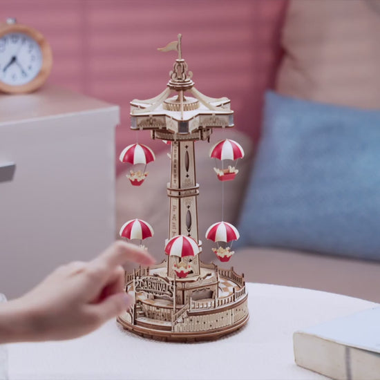 Step into a world of romance, nostalgia, and gentle motion with the ROKR Parachute Tower EA01, a beautifully engineered DIY wooden music box 3D puzzle from the Magic Amusement Park Series. Inspired by the iconic parachute tower ride found in classic amusement parks, this model re-imagines the experience with staggered up-and-down parachute movement, creating a more dynamic and captivating visual rhythm.